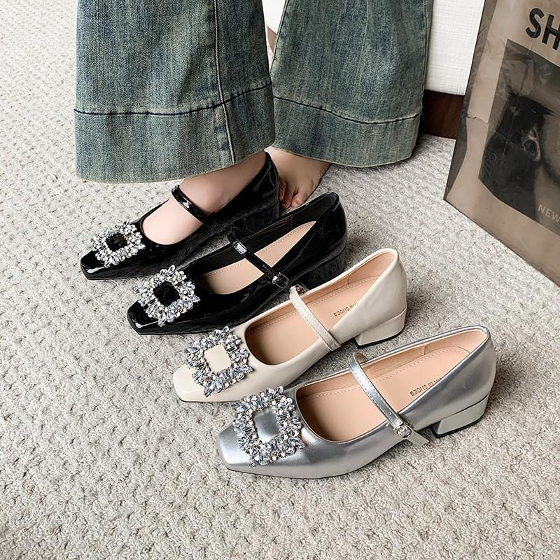 Туфли Мэри Джейн толстый каблук высокие каблуки весна с юбкой туфельки феи модные серебристые стразы одинарные туфли