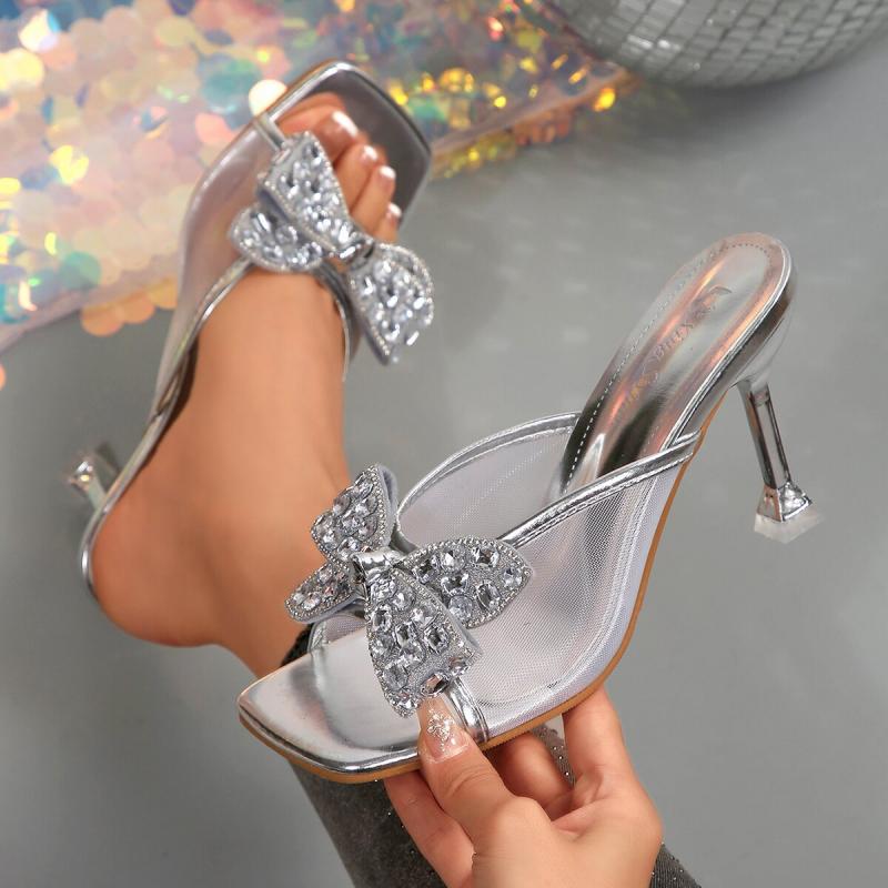 Дизайн бренда Серебристые сандалии с сетчатым ремешком Женские 2025 Лето Блестящее украшение бантом Шлепанцы Сексуальные высокие каблуки Туфли для вечеринки