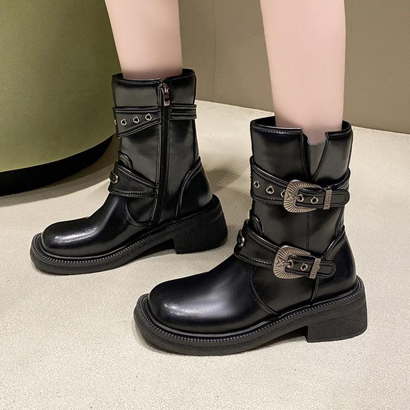 Винтажные сапоги до середины икры с боковой молнией, женские, сексуальные, с квадратным носком, на среднем каблуке, в западном стиле, роскошные дизайнерские туфли с металлической пряжкой