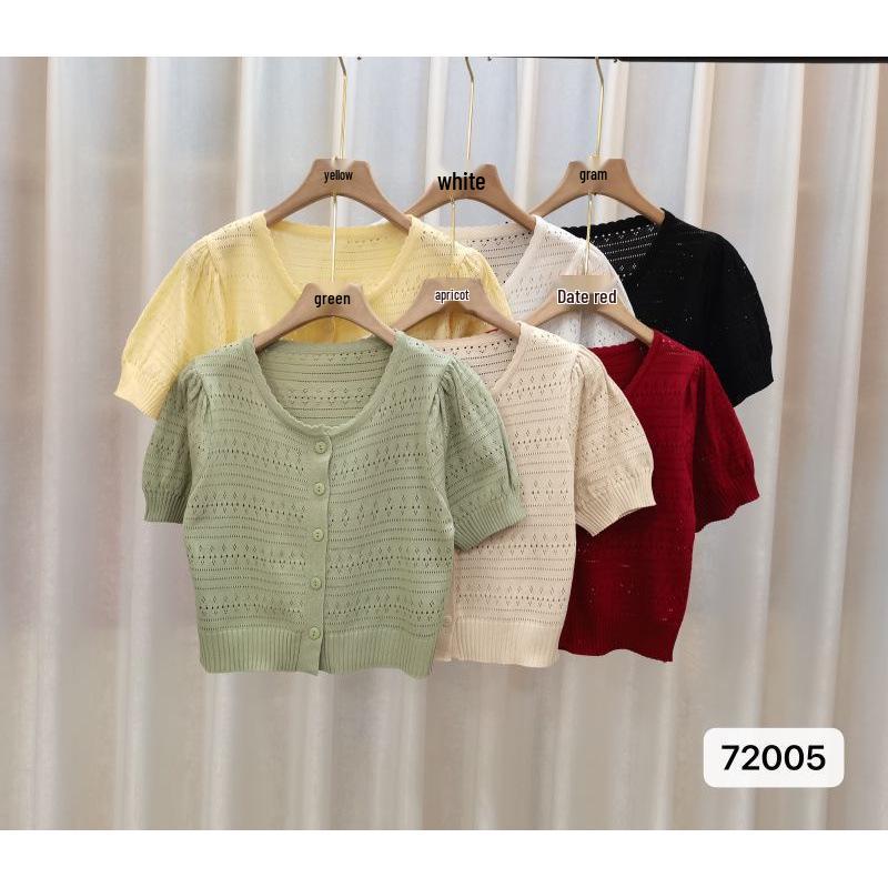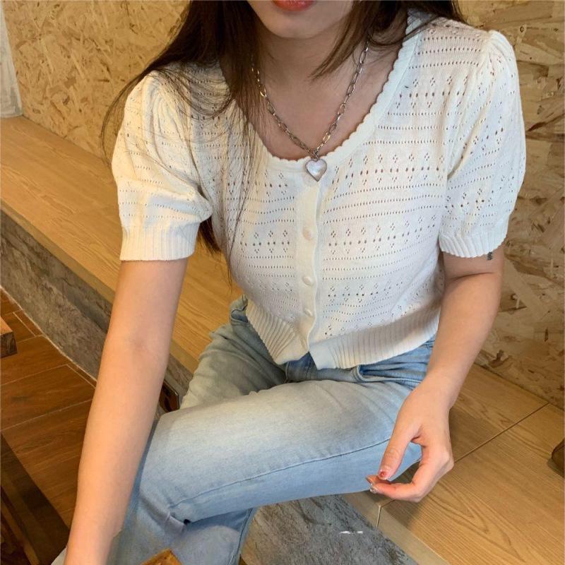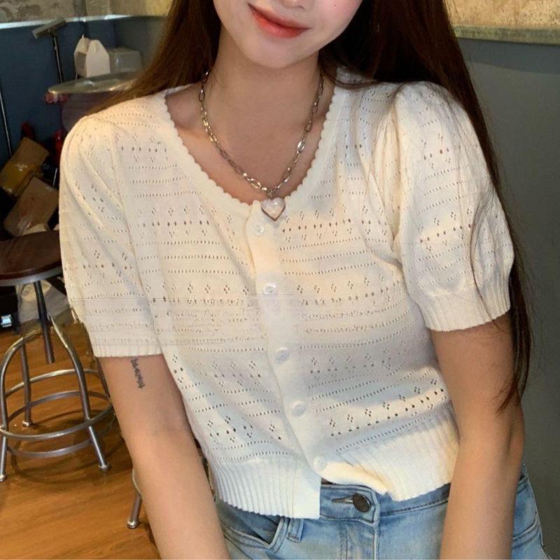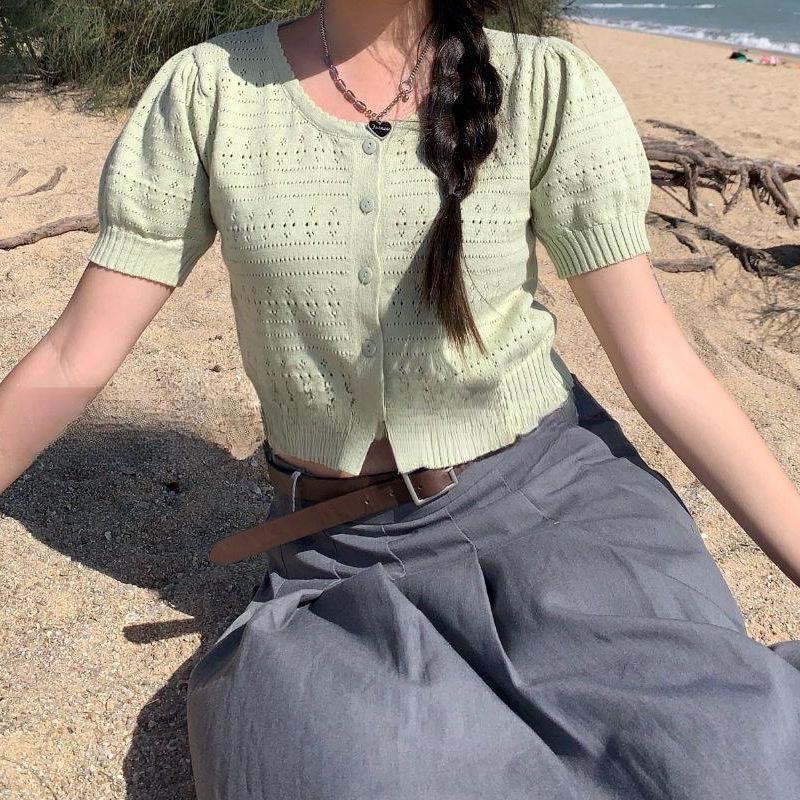 Женский летний кардиган с короткими рукавами и ажурной вязкой, 2024: Однотонный, с высокой талией, легкий плащ