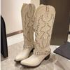 2025 Большой размер 42 Ретро стиль Майяр Коричневые ковбойские сапоги Женские Панк заклепки Массивный каблук До колена Западные Мотоциклетные сапоги Обувь