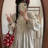 Осеннее вельветовое платье с цветочным принтом 2024: Сладкое кружево, круглый вырез, кружевная вставка, свободный длинный рукав, средней длины для женщин