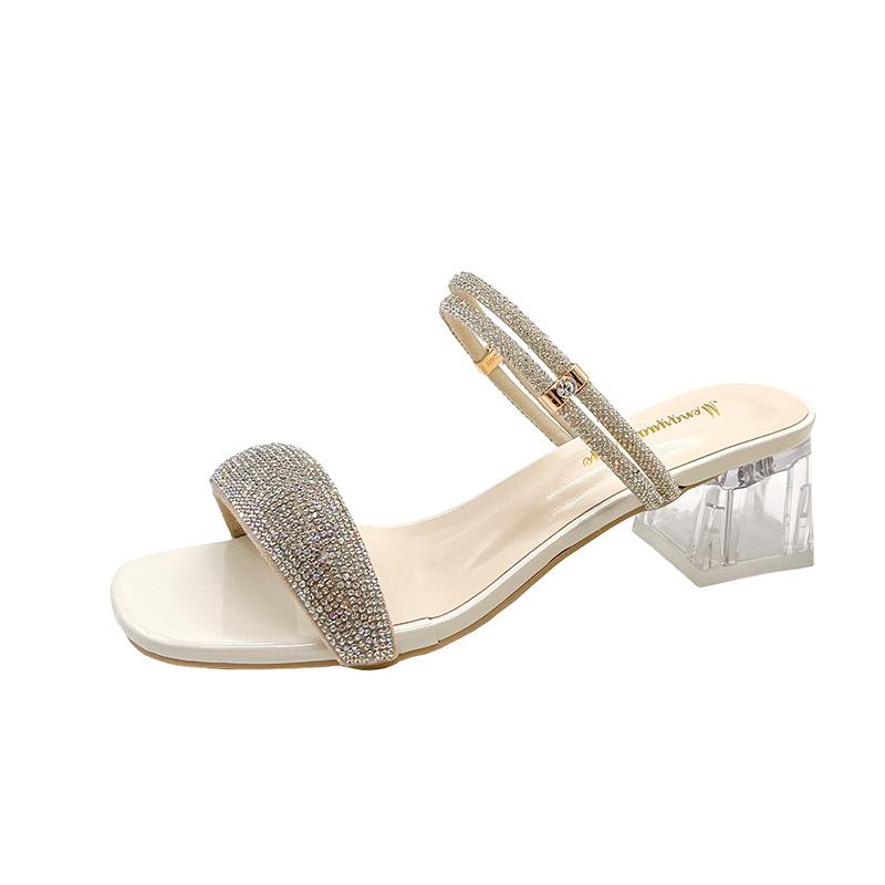 Летние новинки 2025 года Шлепанцы на толстом каблуке Женская обувь Стразы Шлепанцы Средний каблук Квадратный носок Сандалии с двумя способами носки