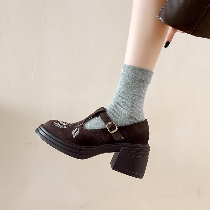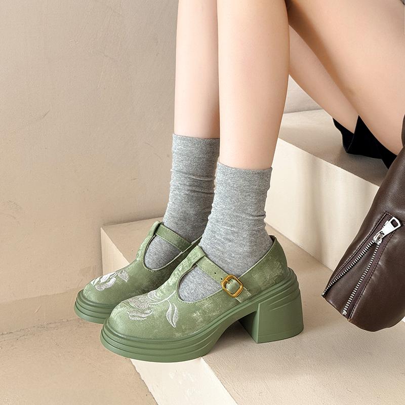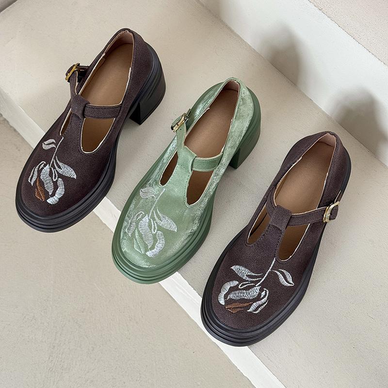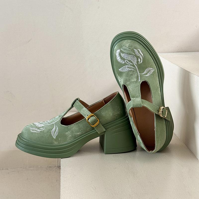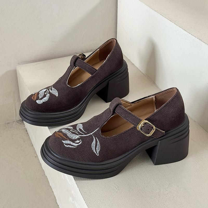 Платформа Толстый Каблук Британский Стиль Ретро Обувь Женские Вышитые Туфли на Высоком Каблуке Лоферы Круглый Носок Одиночные Туфли Мэри Джейн Туфли-Лодочки