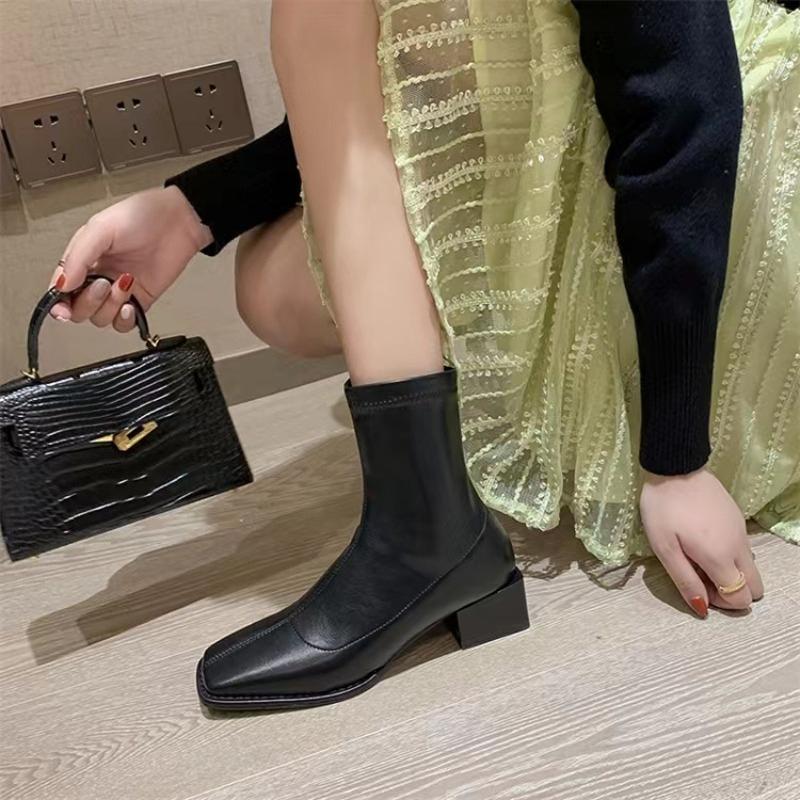 Осень-зима Квадратный носок Британские ботильоны на среднем каблуке Коричневые ботинки на толстом каблуке Женские эластичные ботинки Ботильоны Женские ботинки Туфли Высокие