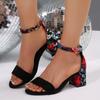Женские черные флисовые сандалии на высоком каблуке с узором 2025 Женская обувь на высоком каблуке с открытым носком Ремешок на щиколотке Обувь на толстой подошве