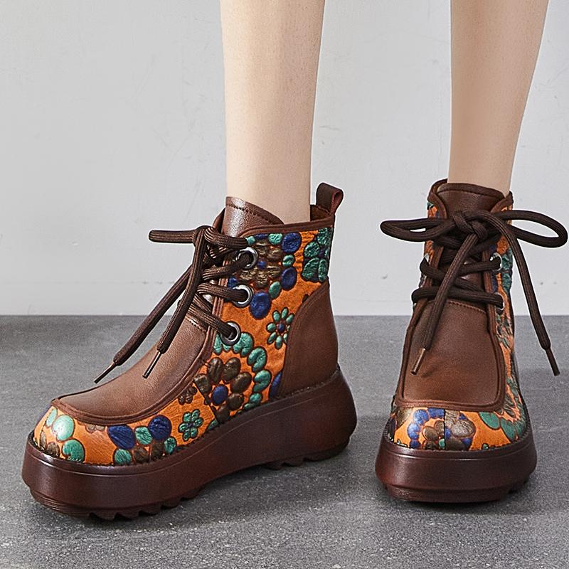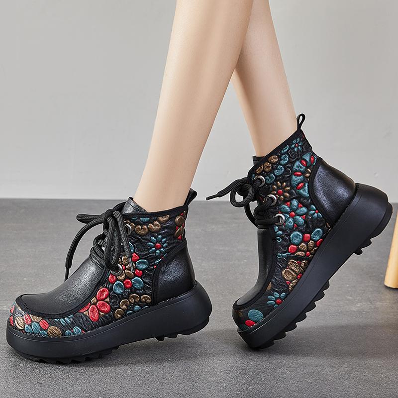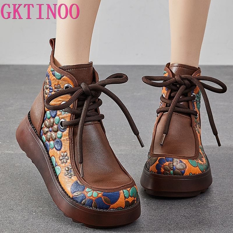 GKTINOO Женские ботинки из натуральной кожи, обувь в стиле ретро, 2024, новая коллекция осень-зима, принт, круглый носок, шнуровка, ручная работа, лаконичные ботинки на платформе