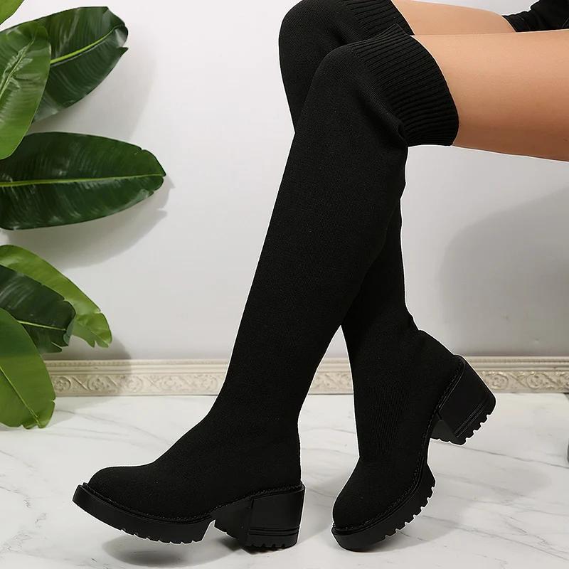 Модные эластичные вязаные ботфорты большого размера для женщин, на толстом каблуке, весна-осень 2025