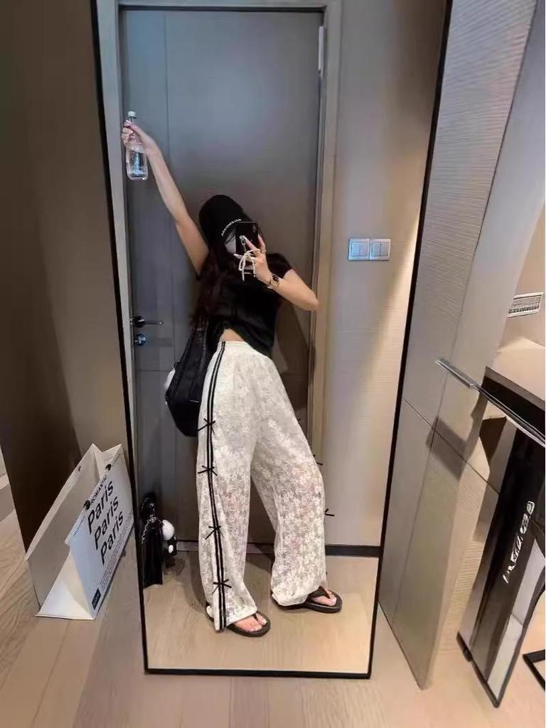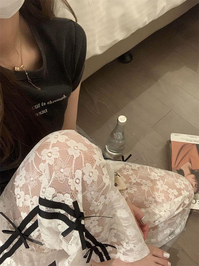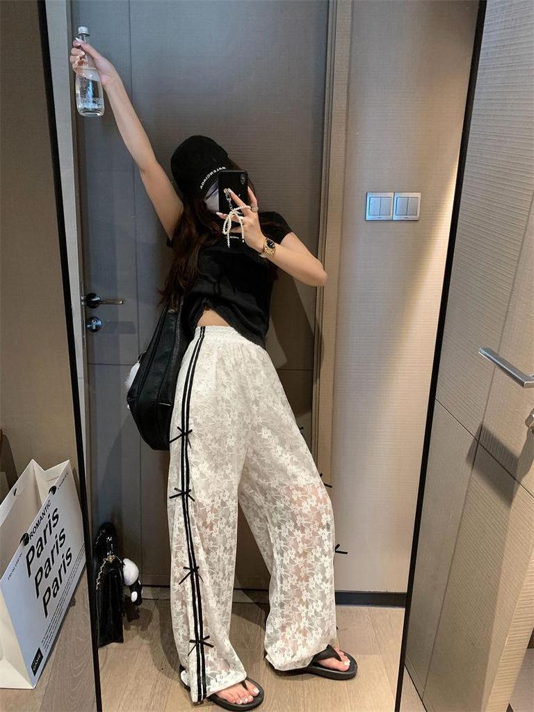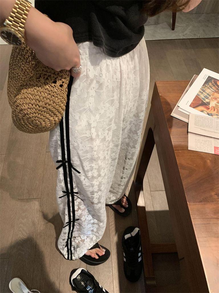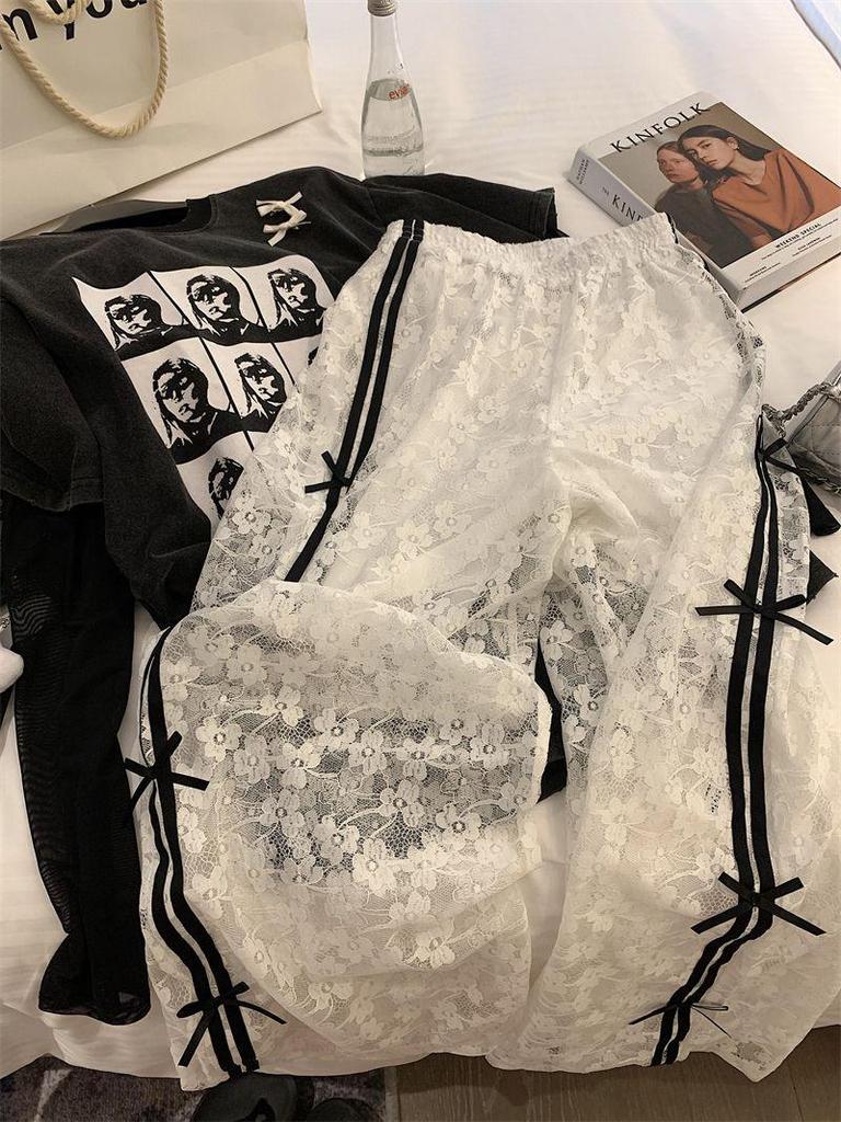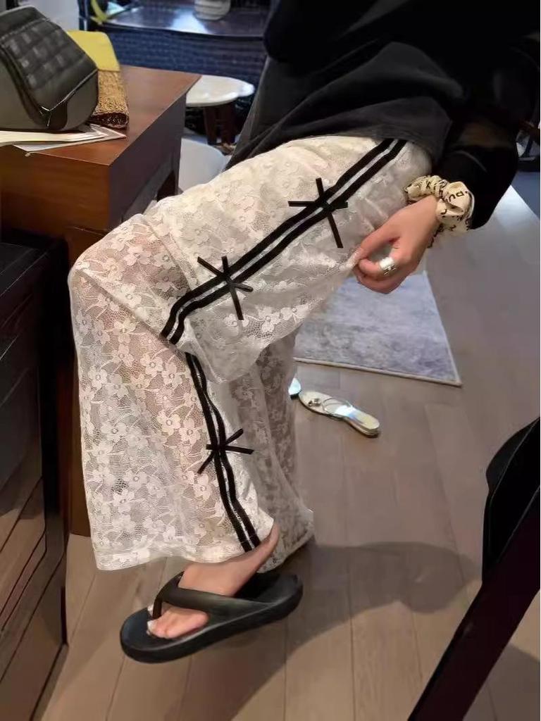 Женские летние брюки с цветными блоками, кружевной отделкой пэчворк и бантом, широкие штанины