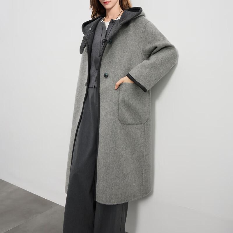 Sancai 2025 Зимнее двустороннее шерстяное пальто с капюшоном свободного кроя
