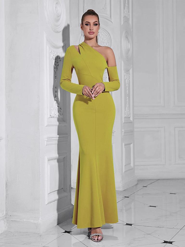 Это вечернее платье излучает элегантность благодаря своему изысканному дизайну на одно плечо и облегающему силуэту.. Изготовленный из высококачественного полиэстера, он обеспечивает комфорт и стиль.. Платье имеет сексуальный вырез на спине, дополненный изящными длинными рукавами, что делает его идеальным выбором для официальных мероприятий.. Его изысканный дизайн гарантирует, что вы произведете неизгладимое впечатление на любом мероприятии.