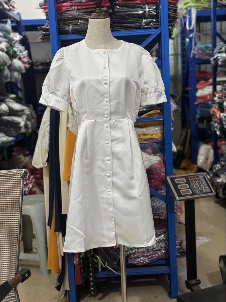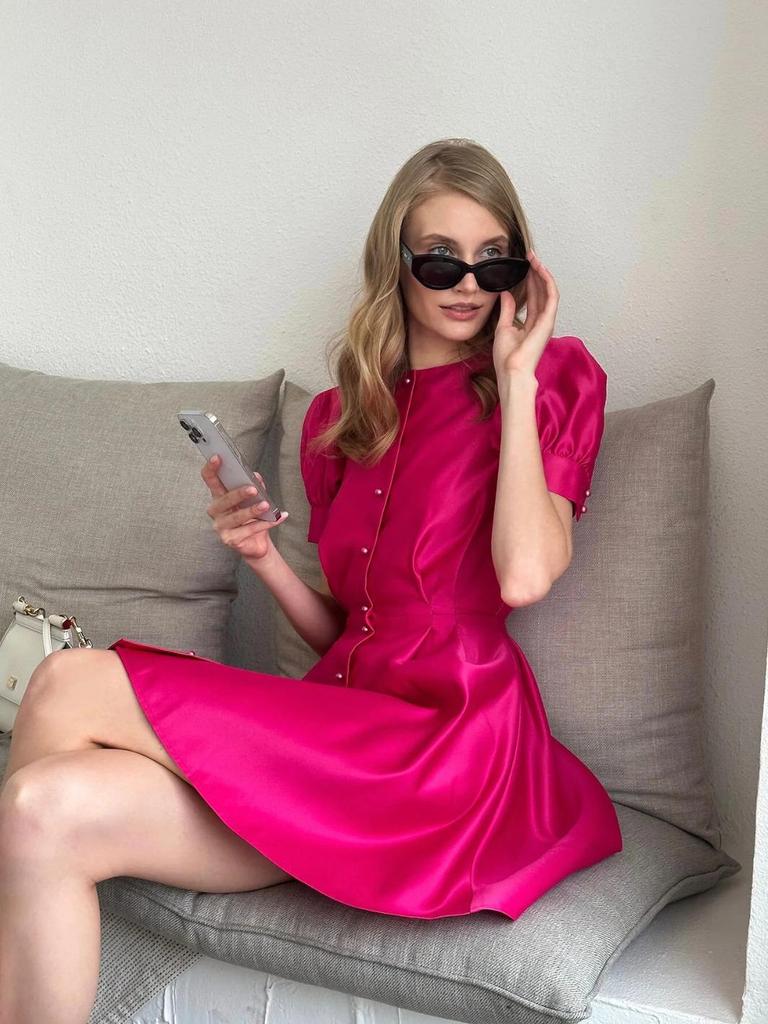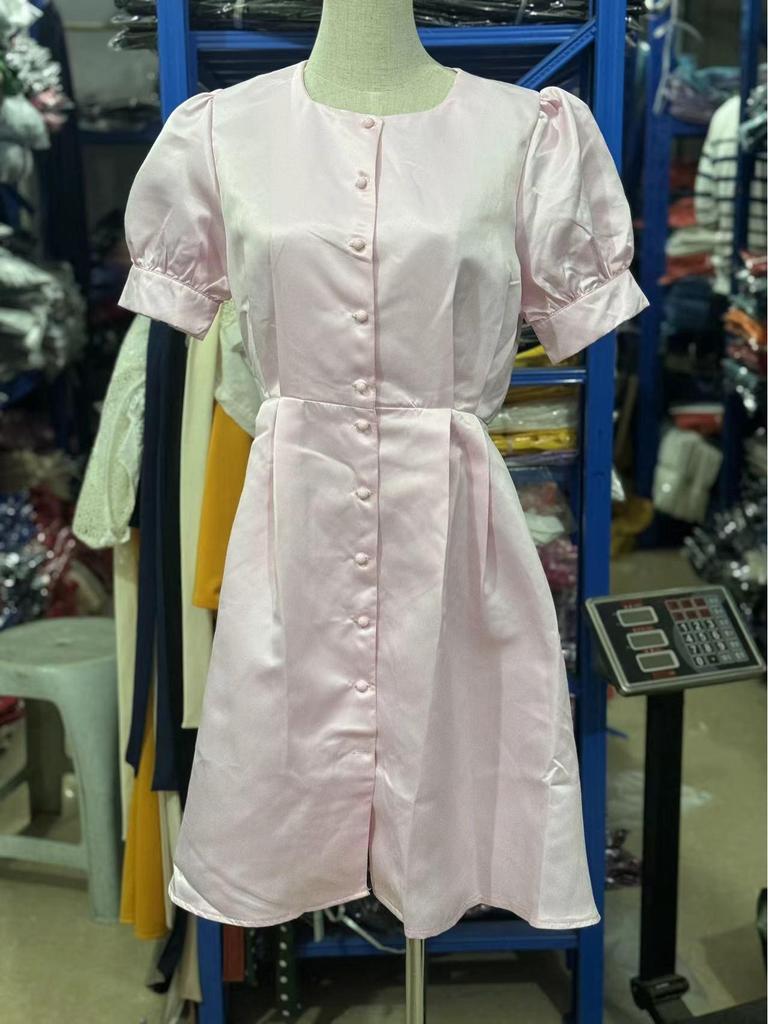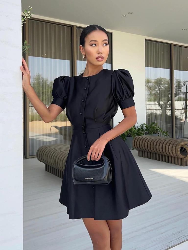 Европейский и американский стиль, миди-платье А-силуэта со сборками на талии, круглым вырезом, короткими рукавами-буфами и жемчужными пуговицами для женщин