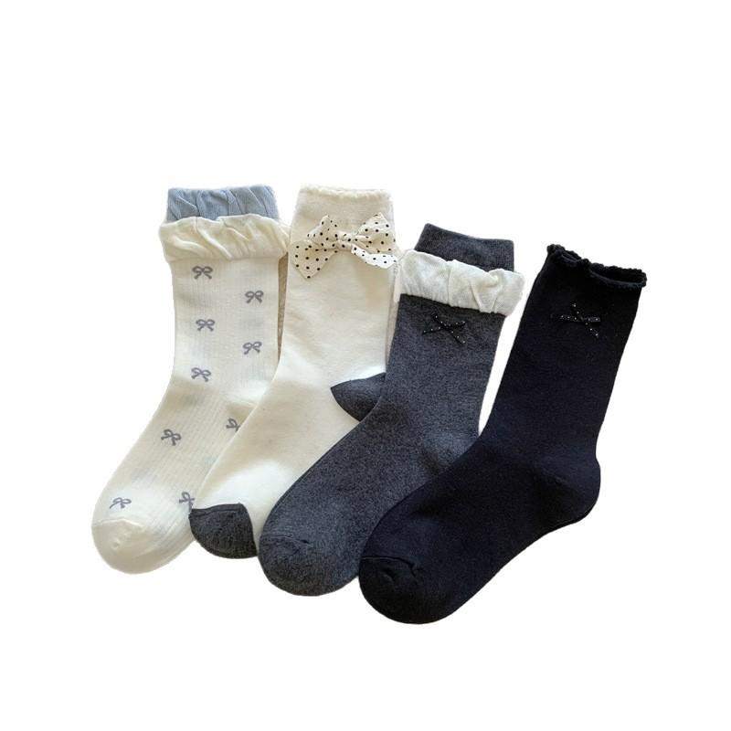 Осенние носки до середины икры с бантом в горошек для женщин, милые кружевные хлопковые носки с отворотом в виде пузырьков