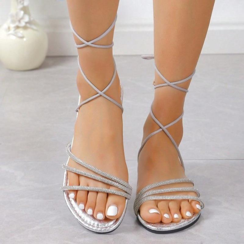 Летние Новые Сандалии Круглый Носок Открытый Носок Пайетки Перекрещенные Тонкие Тонкие с Мягкой Подошвой Противоскользящие Износостойкие Ремешок Плоская Обувь