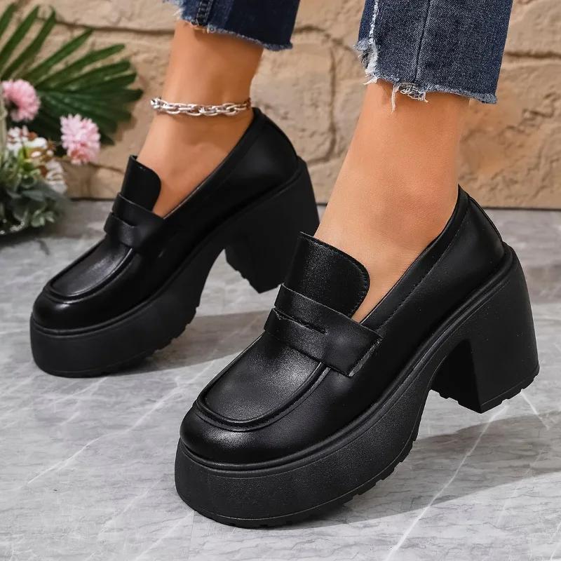 2025 Горячая Распродажа Новые Лоферы Женские Туфли на Высоком Каблуке Круглый Носок Массивный Каблук Классика Повседневные и Офисные Туфли Женские Слипоны Обувь на Платформе
