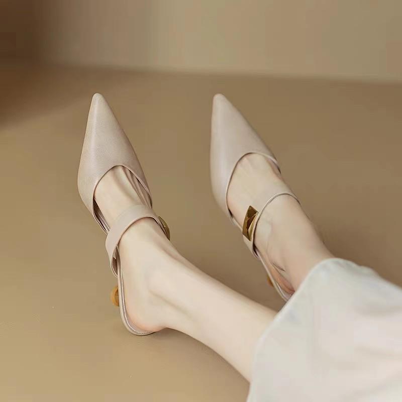 Новые женские мюли на каблуке-рюмочке больших размеров 35-42, летние сандалии с острым носком и золотыми заклепками, бежевые повседневные туфли на среднем каблуке