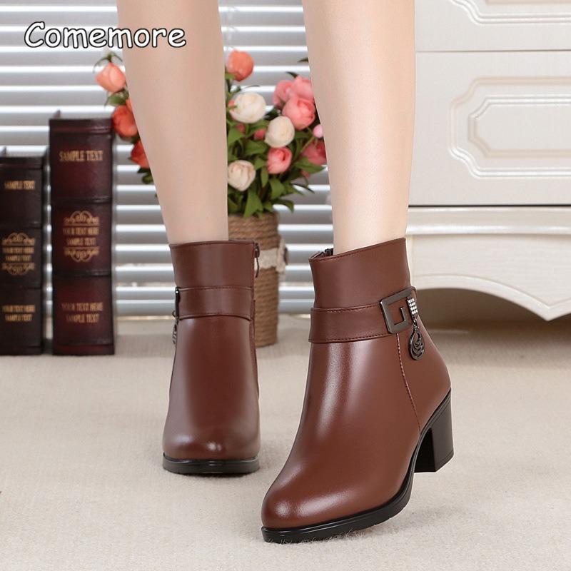 Празднуйте Зимние Меховые Сапоги Высокий Каблук Коричневые Женские Сапоги на Каблуке Взрослые Женские Туфли 2025 Натуральная Кожа Теплые Ботильоны Черные