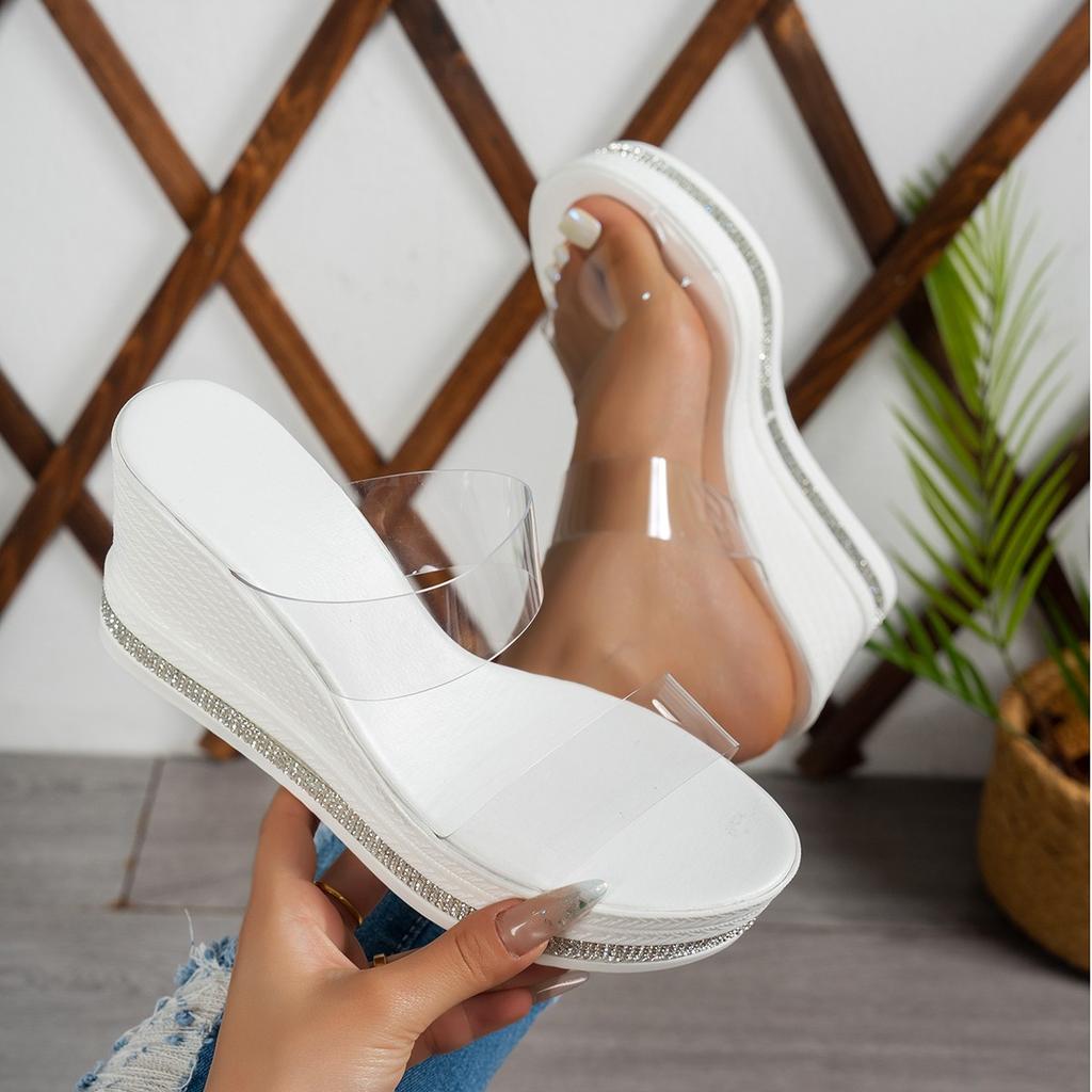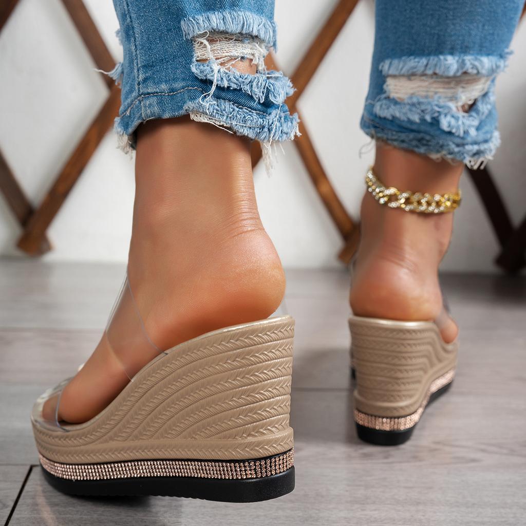 Женская обувь Лето Новинка Слипоны Женские Туфли на Высоком Каблуке Кристальные Туфли на Танкетке Женские Босоножки с Открытым Носком Повседневные Женские Тапочки