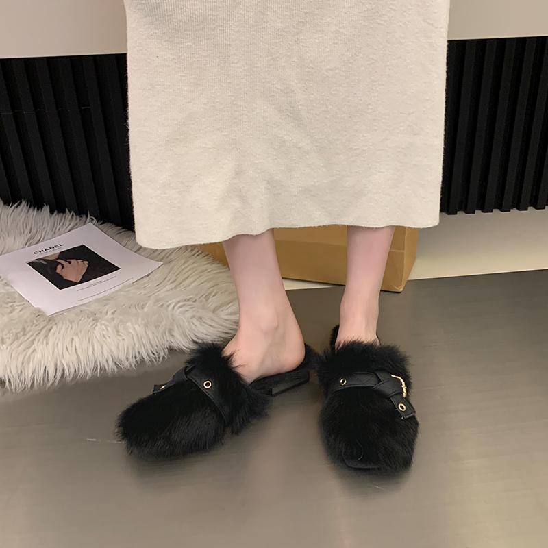 Зимние Новые Тапочки Баотоу Женские Круглый Носок Плюшевые Глубокий Вырез Заклепки Мягкая Подошва Противоскользящие Износостойкие Плоские Туфли