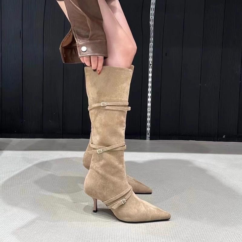 Модная изящная обувь Узкие ботинки Женские тонкие ремешки Заостренный замшевый тонкий каблук Высокие ботинки Но до колена Каблуки Ботинки Женские