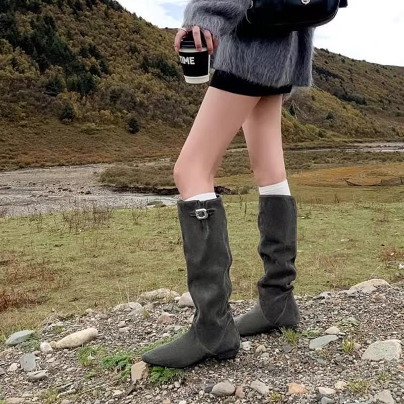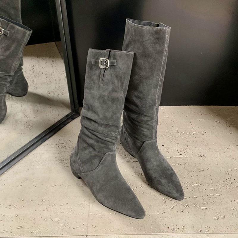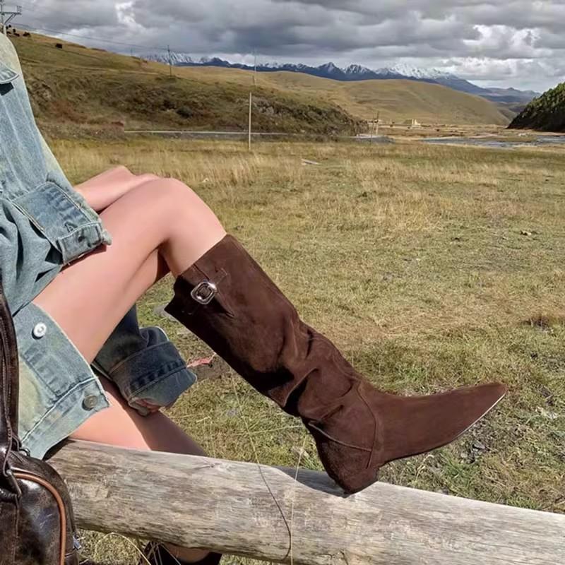 Внутреннее увеличение высоты 6 см, ретро заостренная пряжка, женские ковбойские сапоги в стиле вестерн, новинка 2025 года, широкое голенище, тонкие сапоги на тонком ворсе