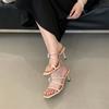 Лето 2025 новое с юбкой квадратный носок модные сандалии женские корейская версия высокий каблук тонкий каблук элегантные французские стразы женская обувь