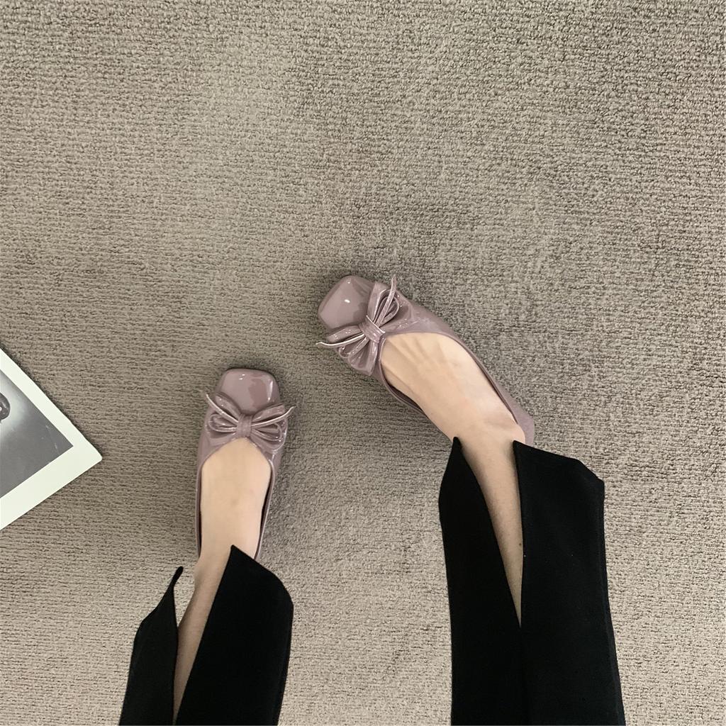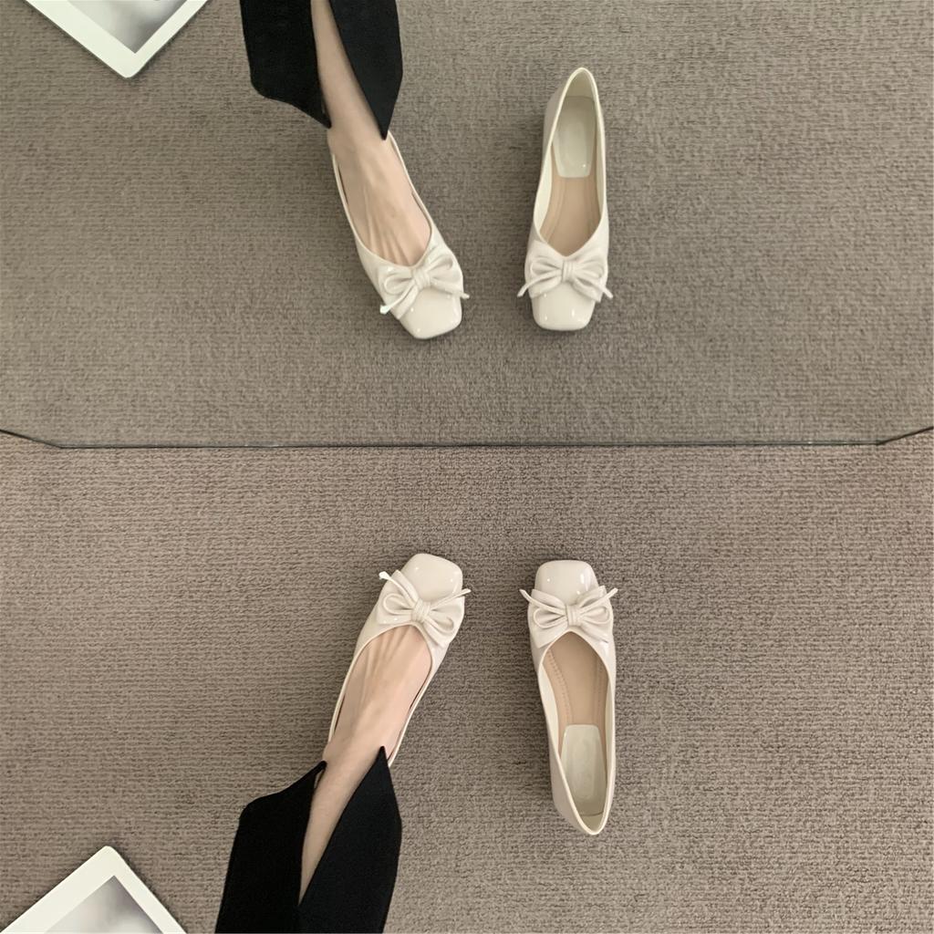 Модная женская обувь на плоской подошве Весна и Осень 2025 Новые туфли-лодочки с квадратным носком и бантом Французский красный Большие размеры Женская обувь