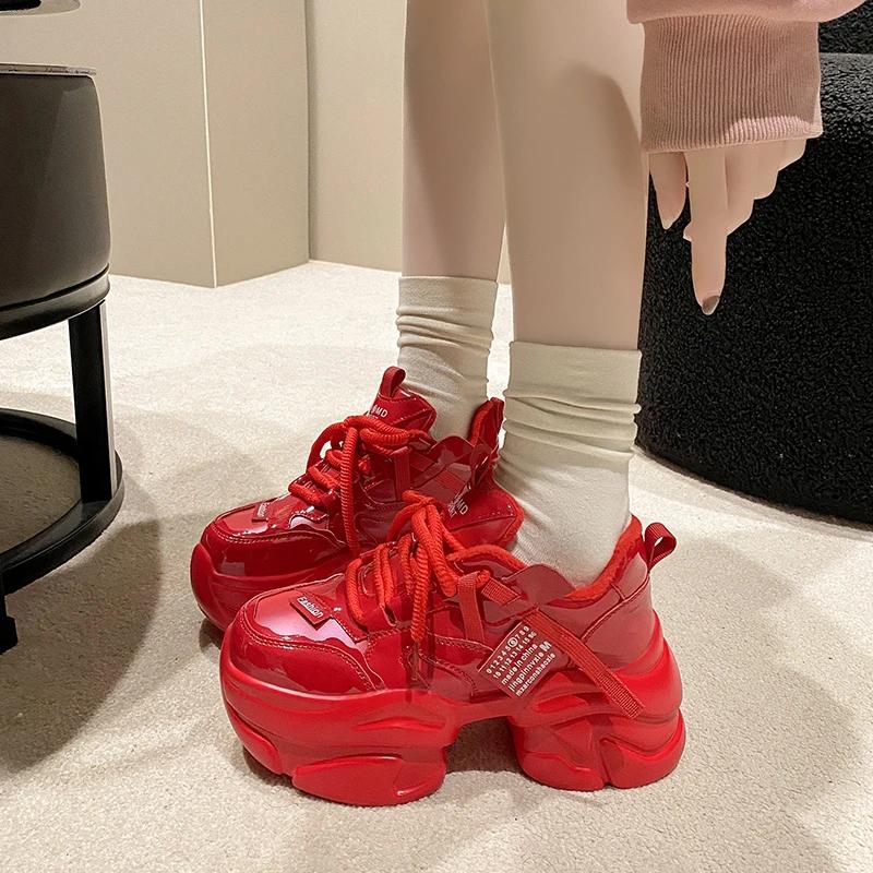 Модные новые женские весенне-осенние массивные кроссовки на толстой подошве 8 см, кожаные туфли на высокой платформе, вулканизированные красные туфли, повседневная спортивная обувь
