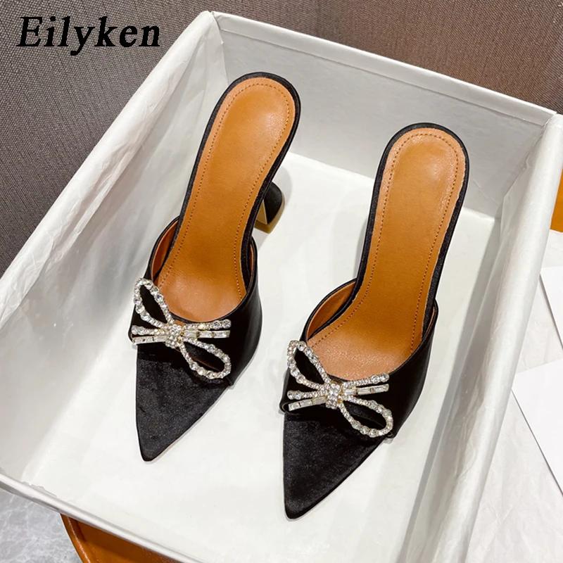 Модные летние шлепанцы Eilyken с бантом-бабочкой, острым носком и толстым хрустальным каблуком, сексуальная уличная женская обувь на квадратном каблуке