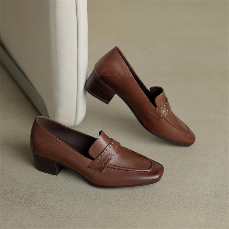 Модная новая весенне-летняя обувь с квадратным носком из натуральной кожи для женщин, модные женские туфли-лодочки с заклепками, женская обувь ручной работы, лоферы на массивном каблуке