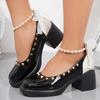 Мода Плюс Размер 2025 Классика Женские Туфли на Высоком Каблуке Ремешок с Пряжкой из Строки Бусин Бант Заклепки Массивный Каблук Лодочки для Платья Смешанного Цвета Офис