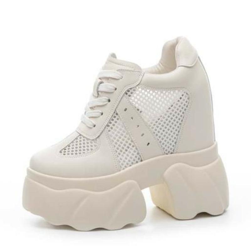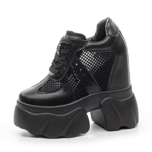 Мода 12 см Женские Летние Туфли из Натуральной Кожи с Воздушной Сеткой на Вулканизированной Платформе-Танкетке, Ультраплатформа-Танкетка, Полые Сандалии-Слайды из Микрофибры