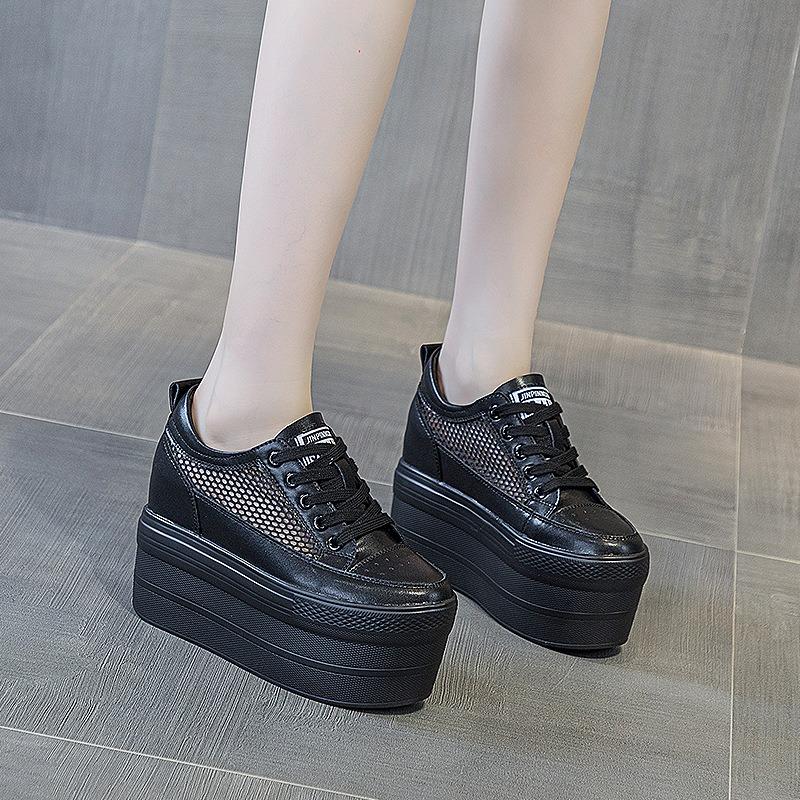 Мода 12 см Женские Летние сетчатые Модные Ins Белые черные Натуральная кожа Массивные Кроссовки Полые Дышащие Туфли на платформе и танкетке