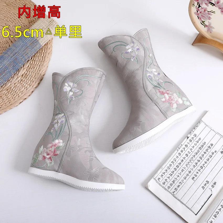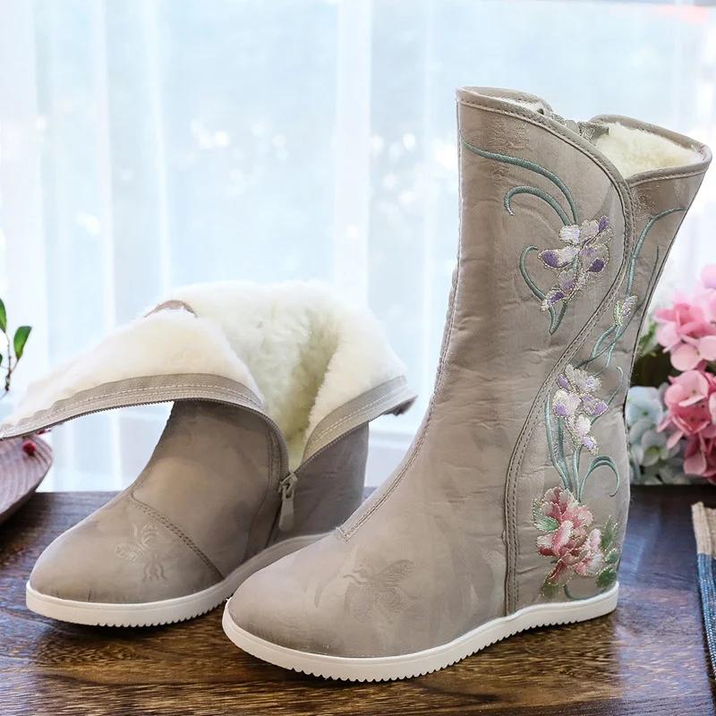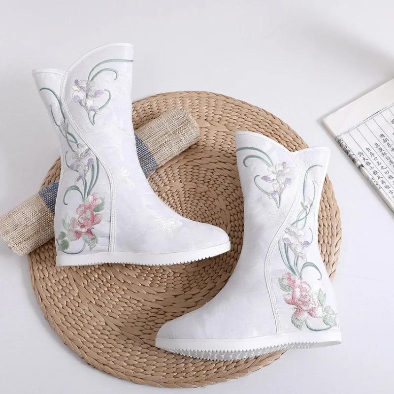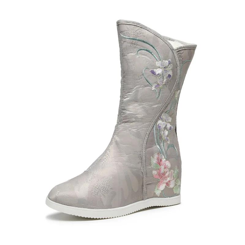 Модные этнические вышитые женские сапоги, обувь ханьфу, зимние высокие женские сапоги, теплые вышитые пионами туфли, женская тканевая обувь