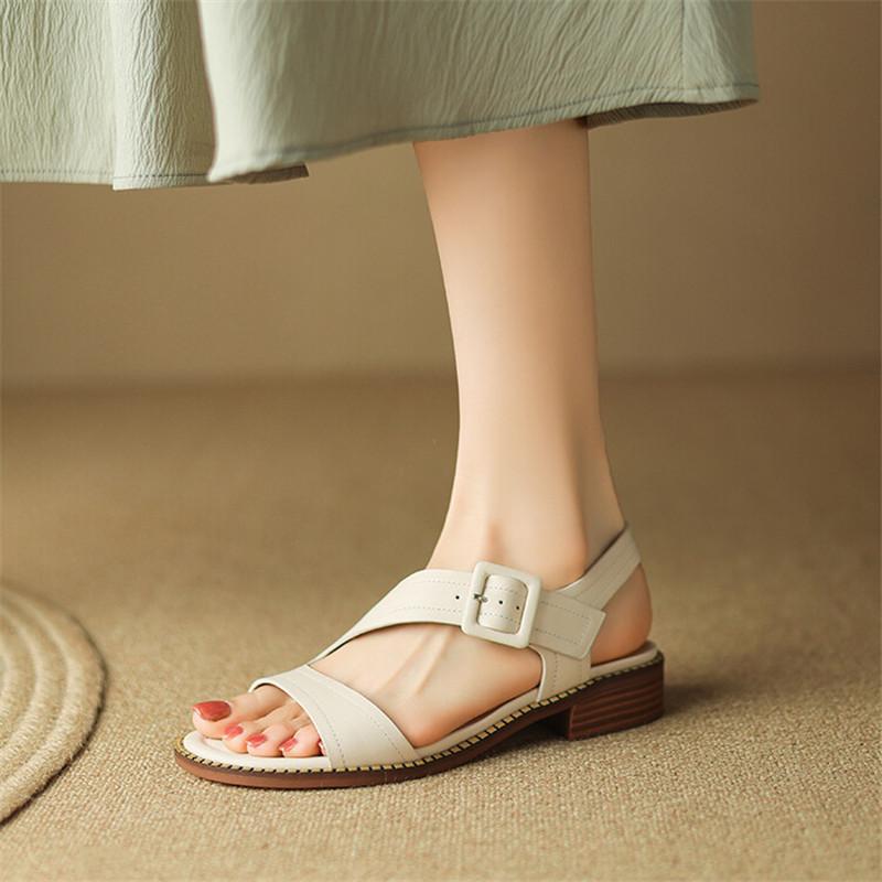 Модные новые летние сандалии из натуральной кожи для женщин, туфли с круглым носком, на толстом каблуке, с открытым носком и ремешком на пятке, сандалии из коровьей кожи