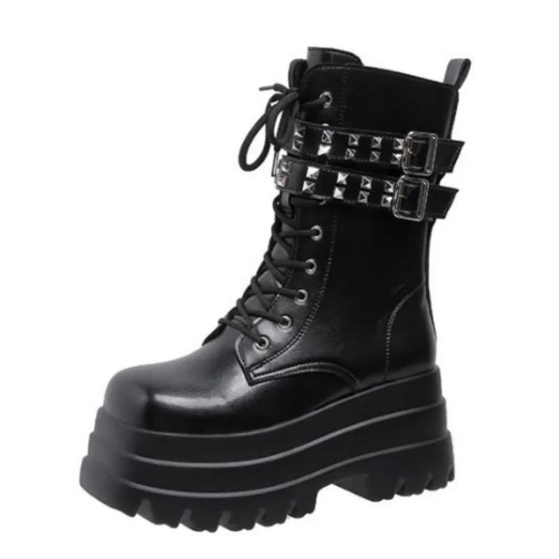 Модные теплые ботильоны на высокой платформе 9 см для женщин, осень-зима, нескользящие, боевые, панк, меховые, с пряжкой, кожаные мотоциклетные ботинки 2024