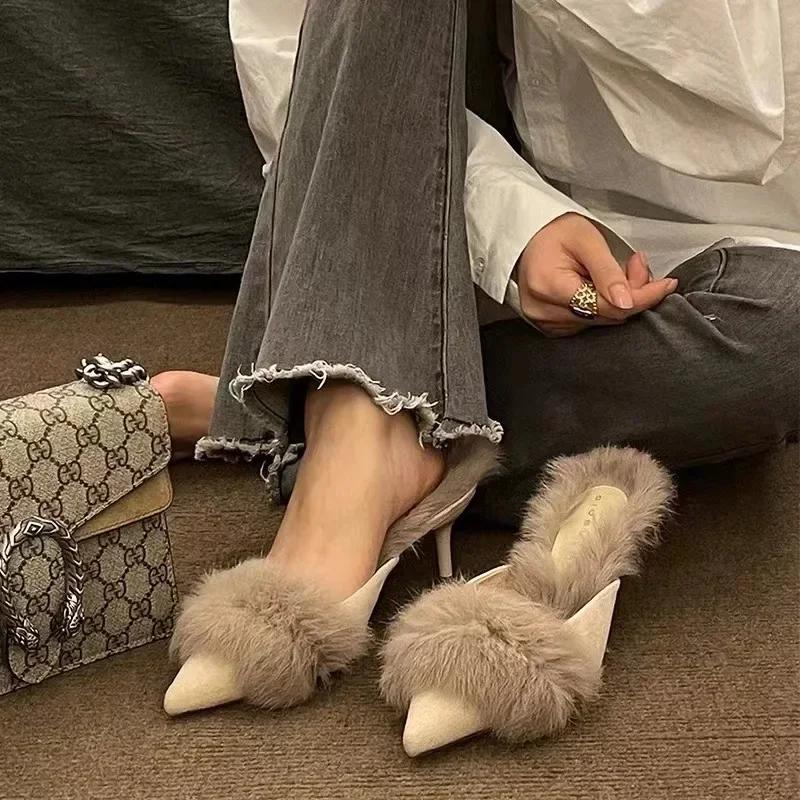 Модная женская обувь на высоком каблуке, меховые тапочки, мюли с острым носком, пушистые шлепанцы, модные элегантные роскошные дизайнерские шлепанцы, офисные туфли-лодочки