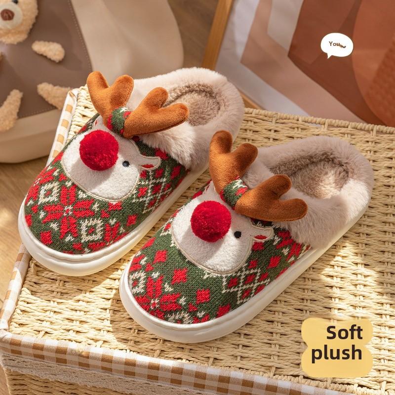 Мода 2024 Новые Рождественские Хлопковые Тапочки Для Женщин Милый Мультяшный Олень Нескользящие Домашние Тапочки Для Девочек Модные Для Вечеринки