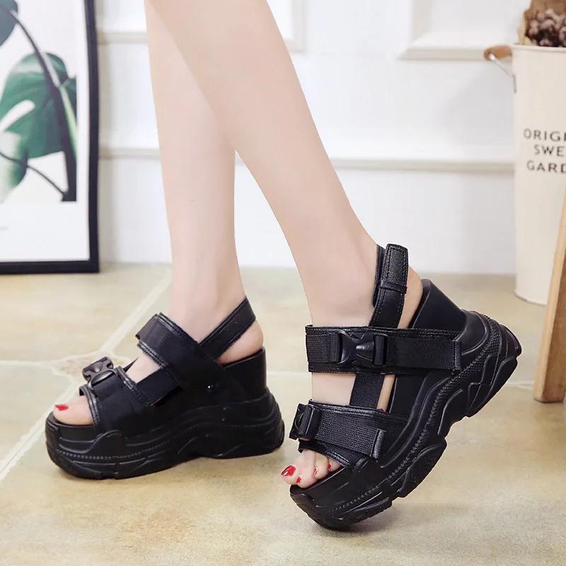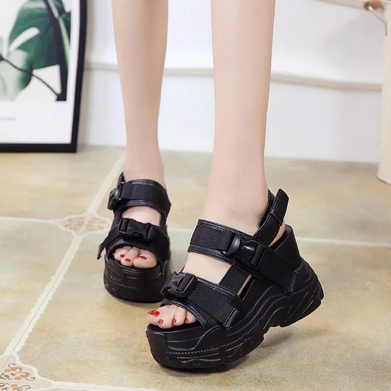 Модные летние новые босоножки на высоком каблуке, размеры 34-39, на толстой подошве-танкетке, плюс высокий однотонный цвет, босоножки с открытым носком, обувь на платформе, женская обувь
