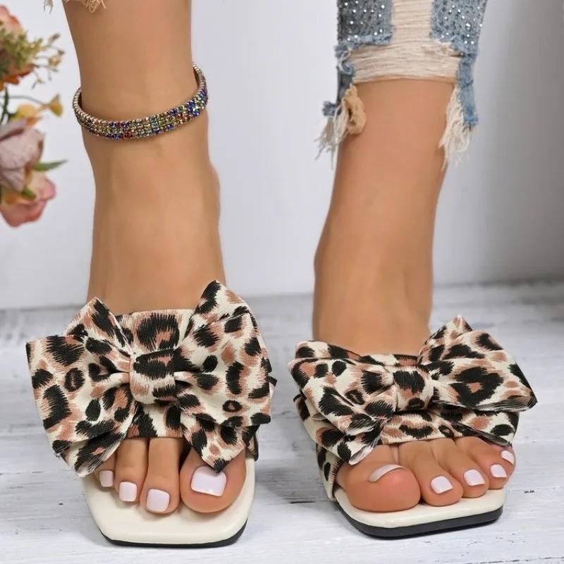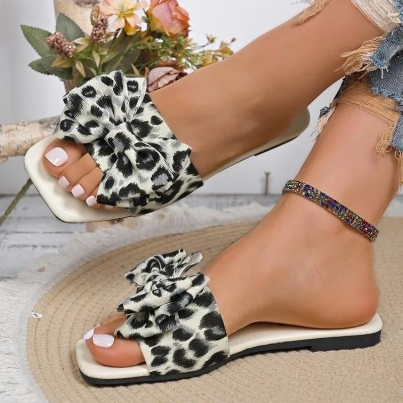 Мода 2025 Новая женская обувь С открытым носком Женские тапочки Модный леопардовый принт Бант-бабочка Большой размер Бестселлер Легкие плоские тапочки