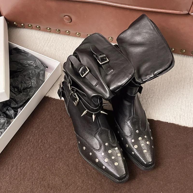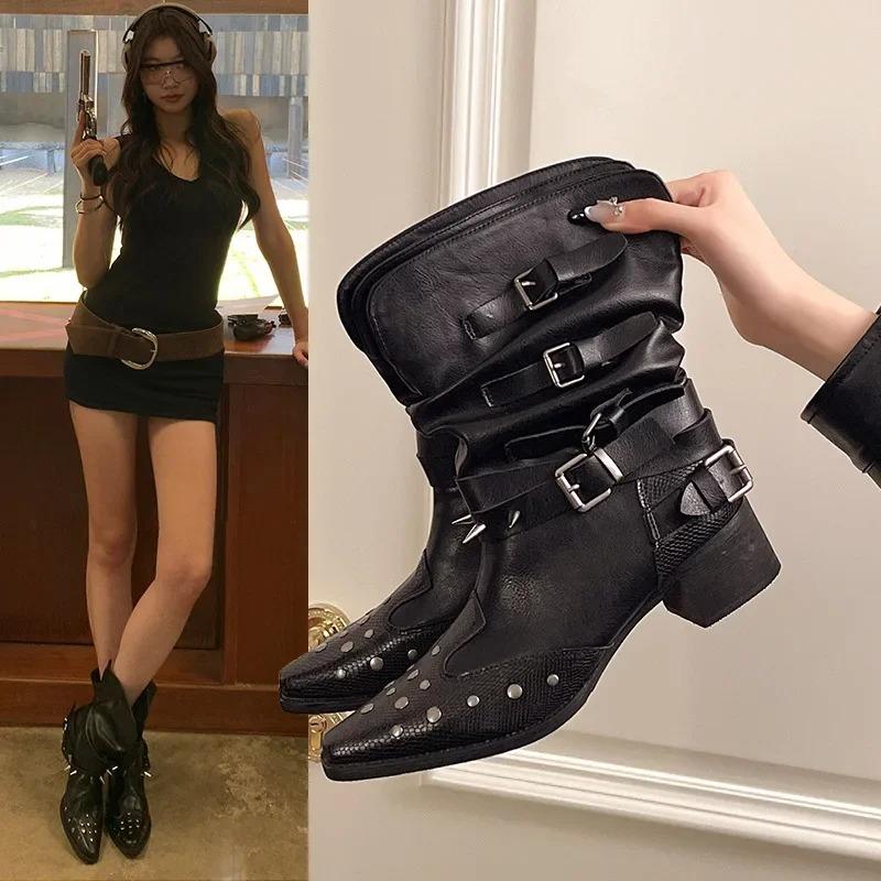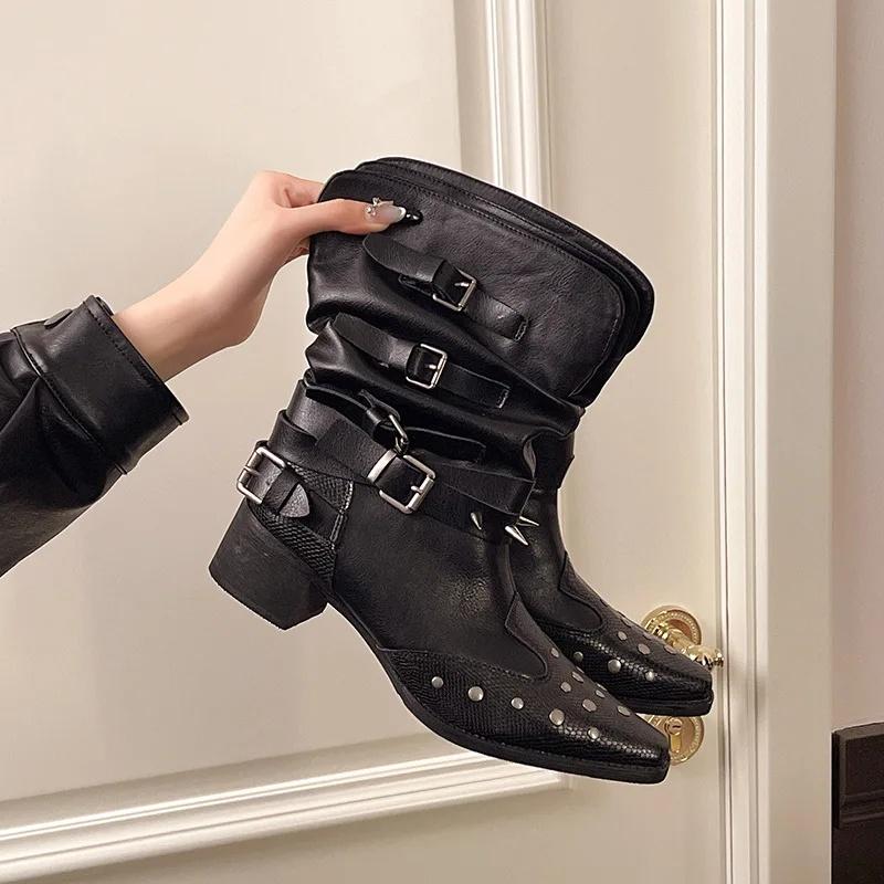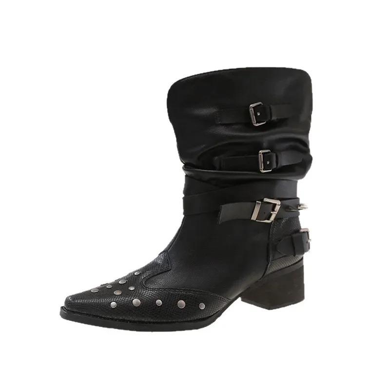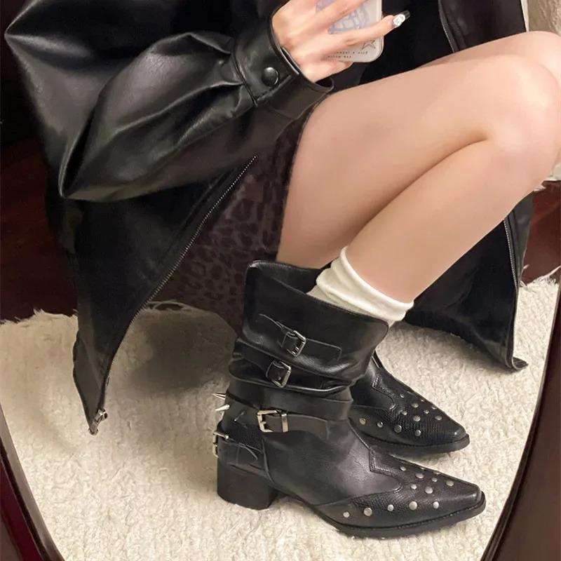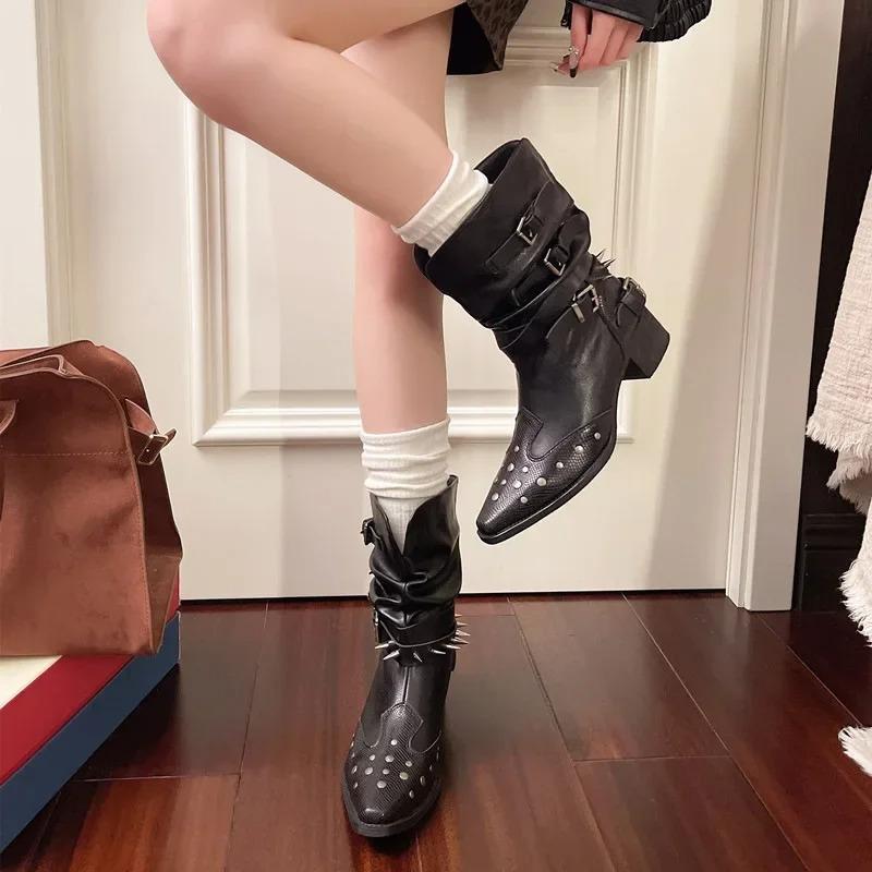 Модные короткие ботинки в западном стиле, модный острый носок, дизайн с плоским голенищем, стройнящие ботинки-рыцари с заклепками, женские модные длинные ботинки