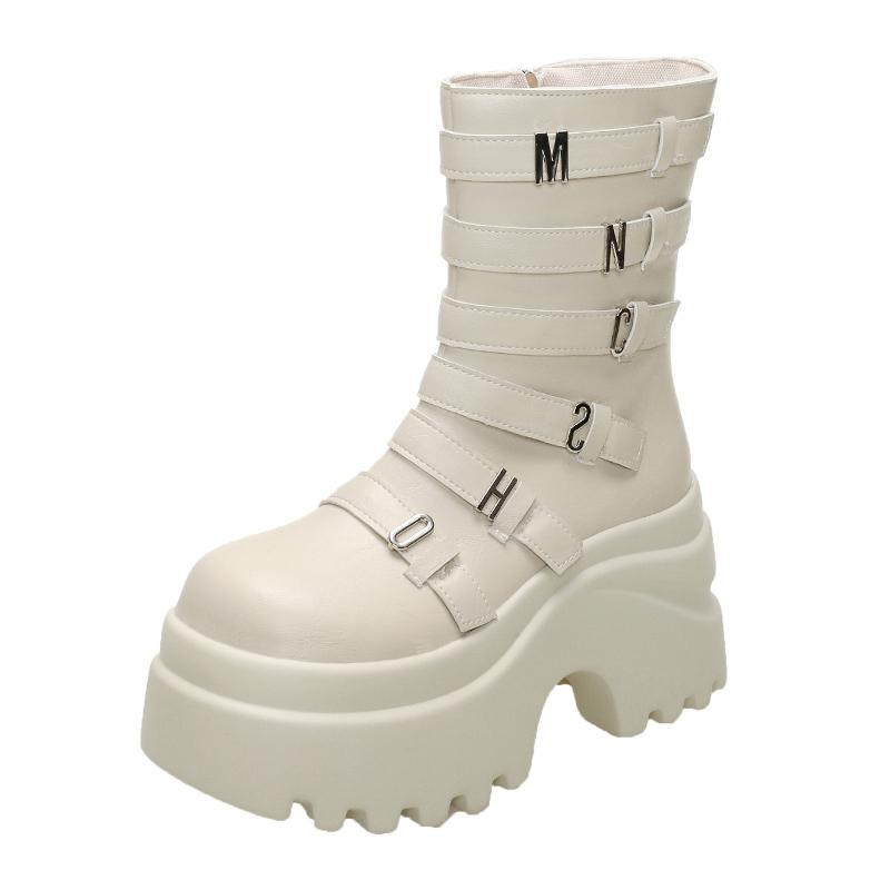 Модная женская панк-обувь, ботинки на высокой платформе 9,5 см, уличная кожаная обувь, новые осенне-зимние металлические ботинки до середины икры, скрытые каблуки, мотоциклетные ботинки