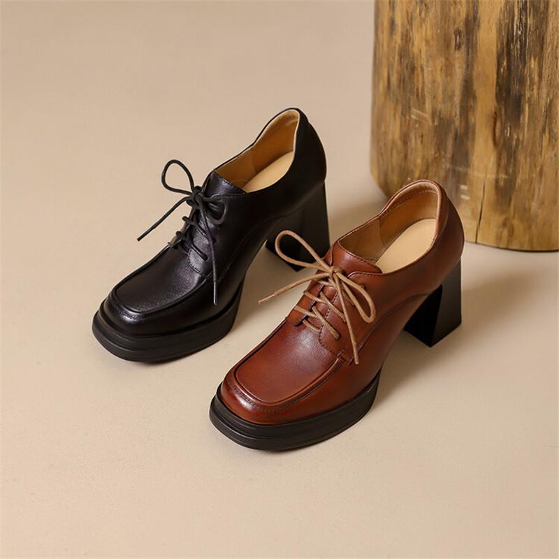 Мода 2025 Новые Весна/Осень Квадратный Носок Массивный Каблук Натуральная Кожа Женские Туфли Лоферы на Шнуровке Женская Обувь Туфли на Высоком Каблуке