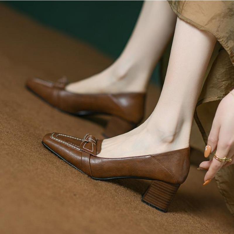 Мода Ретро Бант Высокие Каблуки 2025 Новая Весна Осень Мода Элегантный Квадратный Носок Шпилька Массивный Каблук Туфли Вечеринка Платье Повседневная Обувь