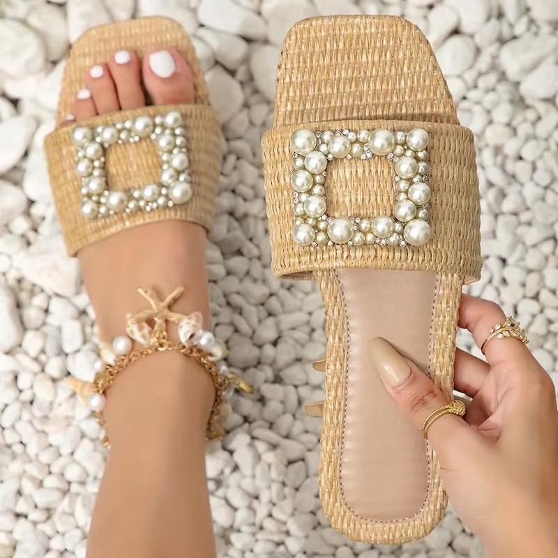 Fashion Eilyken Summer Women Slippers Fashion String Bead Square Toe Flat Heels Casual Outdoor Beach Shoes Ladies Sandals