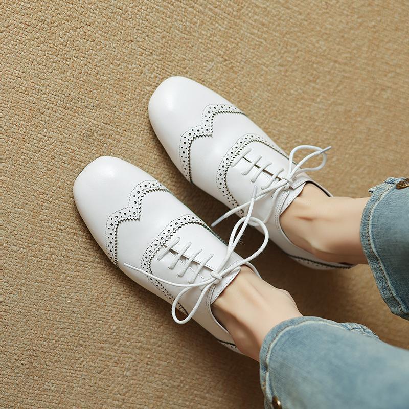 Мода 2025 Женские Новые Весенне-Осенние Туфли с Квадратным Носком из Натуральной Кожи с Резьбой на Шнуровке, Индивидуальные, на Большом Низком Каблуке, Модные Черные Одинарные Туфли