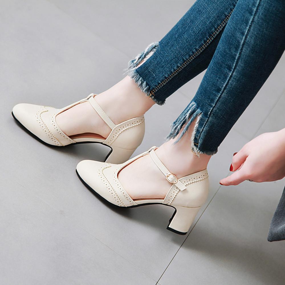 Мода 2025 Винтажная ПУ кожа Женская обувь Римский стиль Вставка Острый носок Пряжка Т-образный ремешок Женские туфли на высоком каблуке Большой размер 32-43