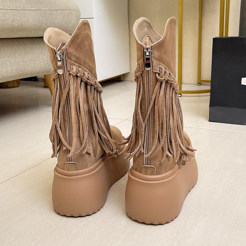 Модные женские туфли на высоком каблуке с кисточками, 8 см, толстая платформа, ботинки до середины икры, кожаные массивные туфли, женские осенне-зимние мотоциклетные ботинки, боты — купить товар онлайн с бесплатной доставкой по всему миру!