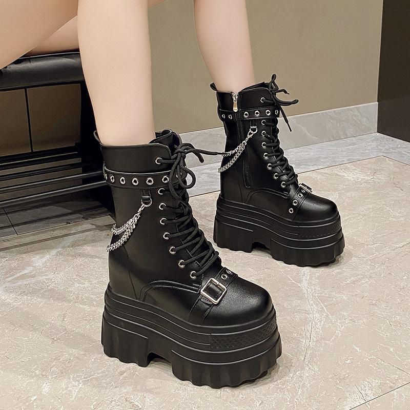 14СМ Женские Ботильоны на Высокой Платформе Осенние Готические Кожаные Ботинки с Пряжкой Панк Мотоциклетные Ботинки Круглый Носок Массивные Кроссовки
