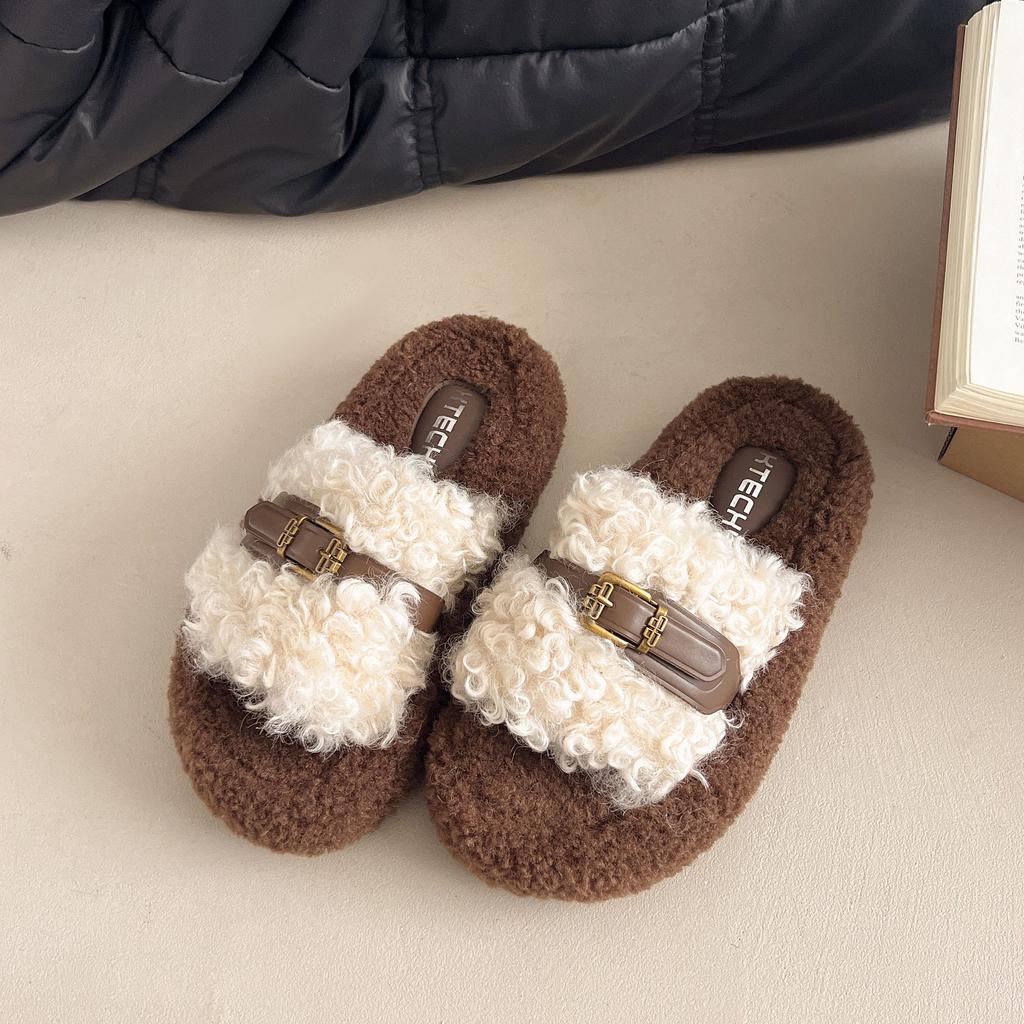 2025 осень новые маффины толстоподошвенные пушистые тапочки женские уличные с ремешком-пряжкой плюшевые хлопковые тапочки